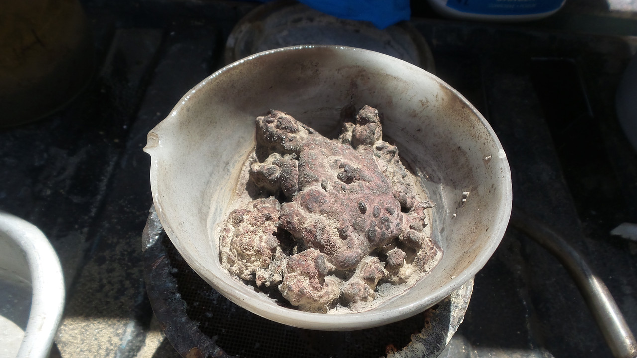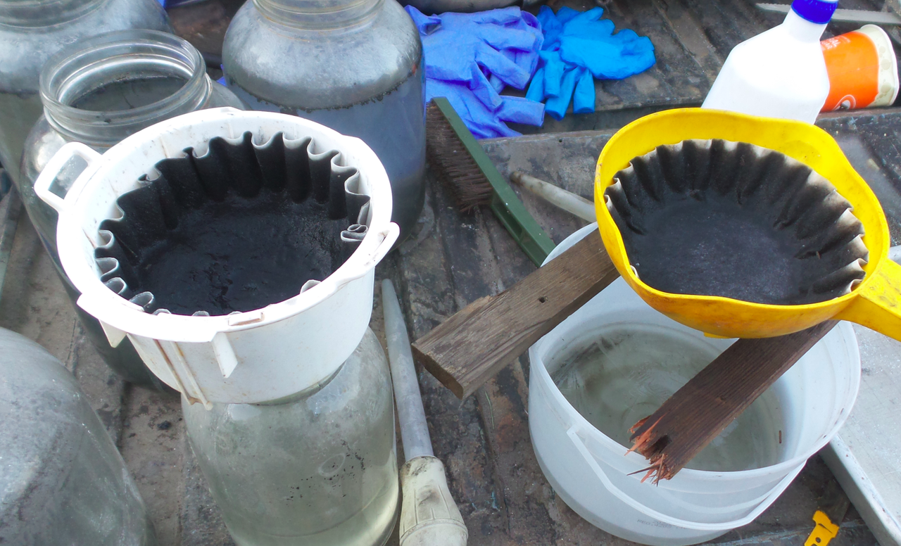 The comb has been broken up and covered with a chemical leach to recover any possible platinum left behind from the sonic treatment, the leach is left at ambient temperature for a couple of days.. Once the pregnant leach has been recovered the precious metals will be cemented out then allowed to settle then decanting and filtering. out the sludge.