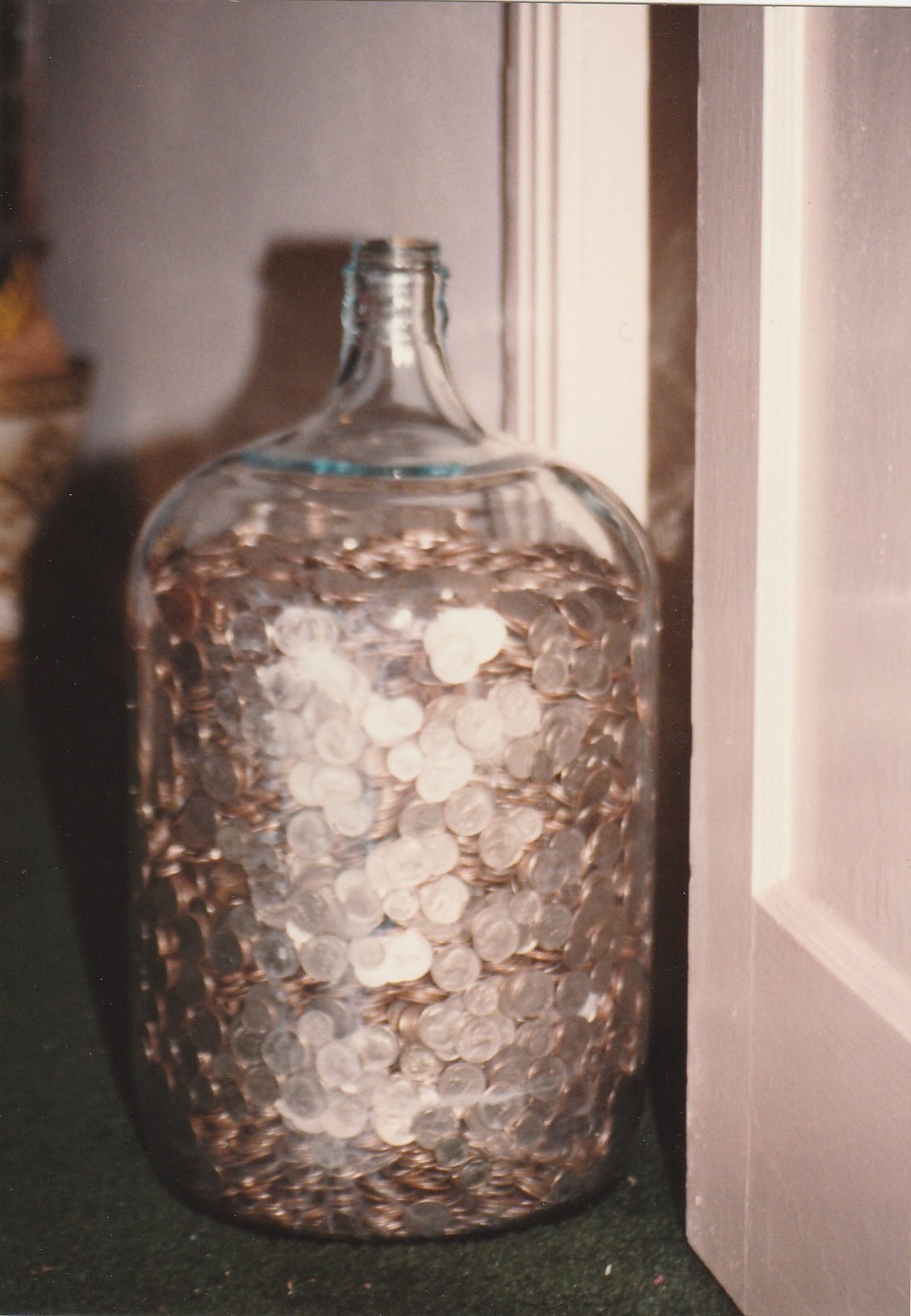 I was cleaning out my closet and was getting rid of a bunch of old pictures and I ran across this. I don't remember how long it took me to accumulate it, but I do remember it was $3,300.00. I used the money as a down payment on my house. It was nickels, dimes and quarters...