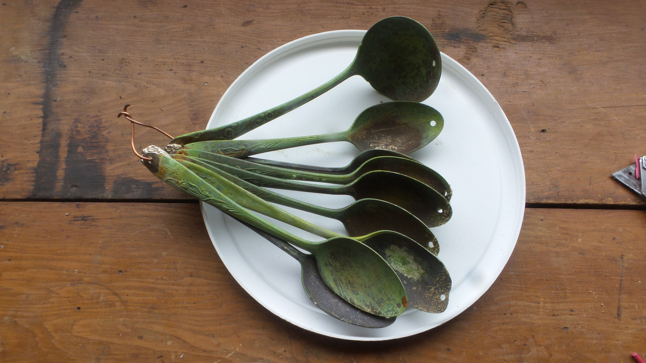Some silver plated flatware that I have de plated, the green color is nickle chloride.= from the salt cell.